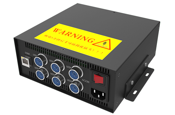 2.光源驱动器驱动口最多达 6 路,各路均可单独或组合联动调节亮度,除适合常规质检系统使用外,还可以运用于超长(最长 2 米)或多工位质检系统光源盒的驱动需要。